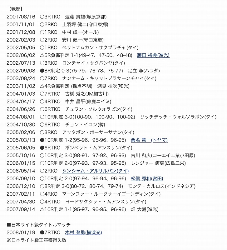 戦績:26戦12勝(6KO)12敗2分
